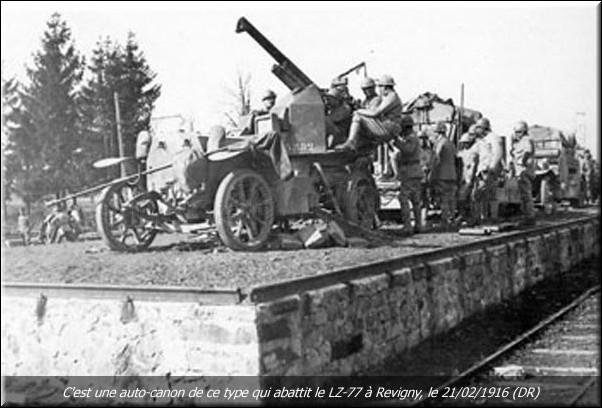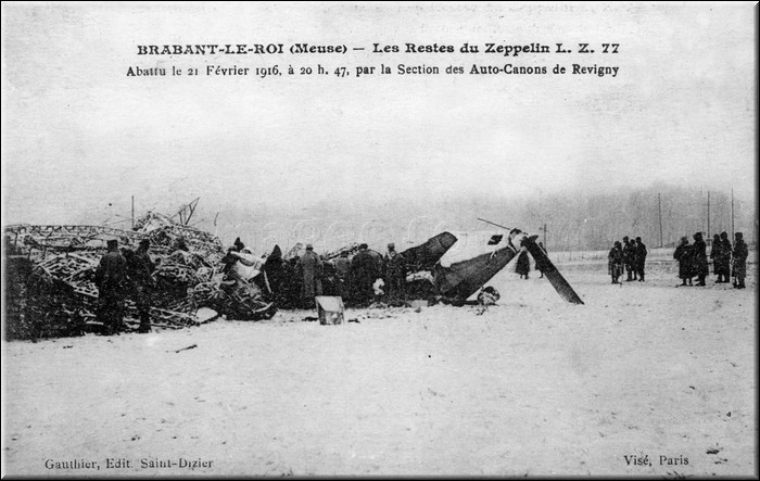 En 1916, l'aviation est à ses débuts et l'état major allemand compte encore beaucoup sur son arme de reconnaissance silencieuse le Zeppelin utilisé à des fins de bombardements. En ce début de janvier, des projets de bombardement d'installations minières afin de déstabiliser l'ennemi et surtout une guerre de concurrence. Un raid en direction du Creusot en raison d'une météo désastreuse est annulé. Mais d'autres projets sont prévus par l'état major allemand surtout pour couper la route au ravitaillement vers Verdun. Peu de ligne de chemin de fer montent vers le front, une à l'est mais dont une partie est en territoire ennemi, la seule stratégique comme la route est celle qui part de Bar Le Duc, la suivant venant de Vouziers par Bar-Le-Duc. Alors que la bataille de Verdun vient de commencer, les allemands tentent de couper par des bombardements divers le réseau ferroviaire pour isoler la place forte. Le 21 février, à peine la nuit tombée plusieurs Zeppelins font leur apparition dans le ciel de Verdun en complément de l'aviation qui a attaqué dans la journée. Du côté de Revigny sur Ornain, la 17ème section d'auto-canon scrute le ciel en cette fin de journée et en début de soirée, les projecteurs qui brassent le ciel détecte le Zeppelin LZ-77. Celui-çi longe la voie ferrée Vouziers - Bar le Duc et se dirige vers la gare de Revigny sur Ornain. Alors que l'objectif est à une altitude de 2500 m, plusieurs auto-canon font feu sur le dirigeable et ce dernier touché, coupé en 2, en feu largue ses bombes sans atteindre son objectif. Le Zeppelin s'écrase au nord de la commune de Brabant le roi et les autres dirigeables rebroussent chemin. Dans le même temps vers Vitry Le François, un autre dirigeable le LZ-95 est abattu par la DCA Française.